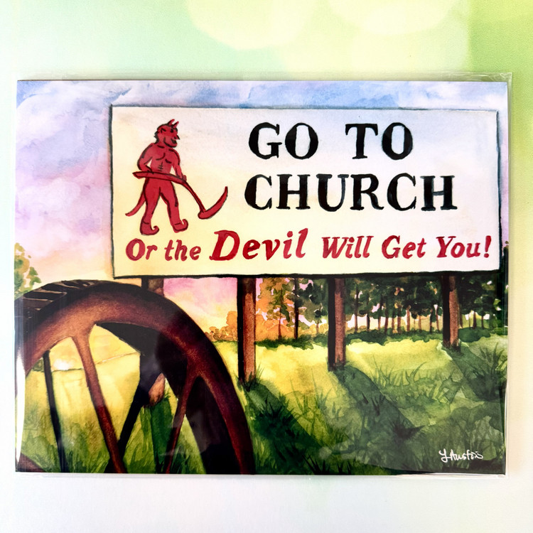 Bring home a piece of Southern roadside history with this vibrant sticker featuring the iconic billboard along I-65 near Prattville, Alabama. Known to generations of travelers, this unforgettable sign — complete with its bold warning and red devil illustration — has become a true Alabama landmark.