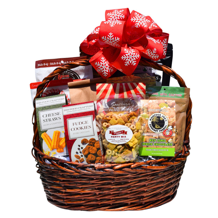 Our Gather and Share basket is sure to cause a stampede of excitement! Overflowing with the most requested, Alabama-made gourmet delights, this abundant collection is packed with flavor and charm. Impress a crowd with an incredible selection of sweet and savory treats, all lovingly crafted by Alabama artisans.