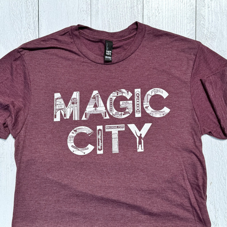 Celebrate the heart and soul of Birmingham with this Magic City tee - a wearable tribute to the city's rich history, vibrant culture, and iconic sights. Each block letter in "Magic City" is filled with hand-illustrated depictions of Birmingham’s most beloved landmarks — from the towering Vulcan statue to the industrial grit of Sloss Furnaces, the classic charm of the Lyric and Alabama Theaters, the historic Rickwood Field, the modern energy of UAB, and the green haven of Railroad Park. You'll also spot local favorites like Pepper Place, the Birmingham Zoo, and more.