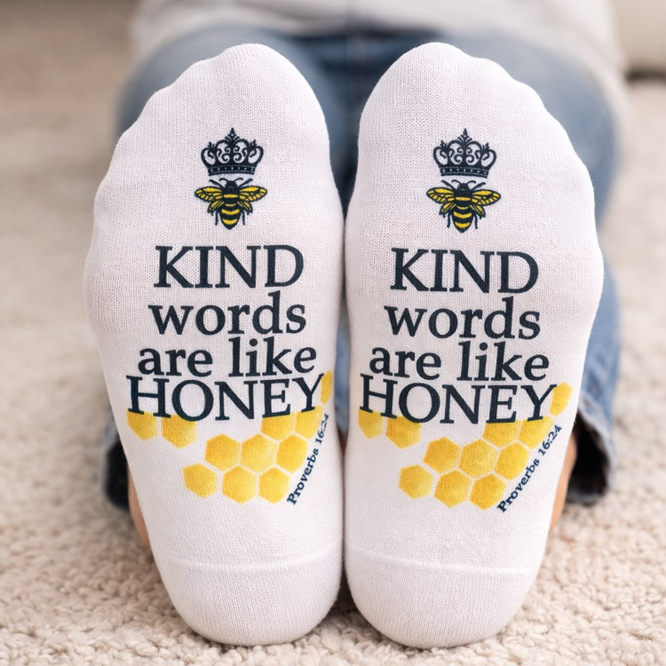 Sweeten your day with a gentle reminder of the power of kindness. These charming no-show socks feature the uplifting verse from Proverbs 16:24: “Kind words are like honey.”