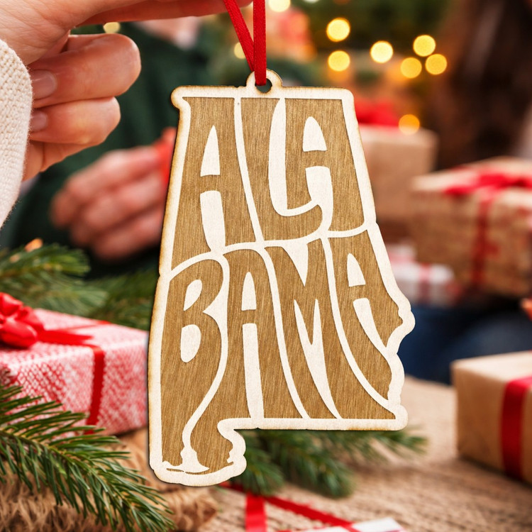 Celebrate home, heritage, and heartfelt moments with this beautifully crafted Alabama ornament. Made from natural wood and precision laser-engraved, this piece features a unique design that artfully weaves “Alabama” filling the state’s shape, creating a warm and eye-catching keepsake.